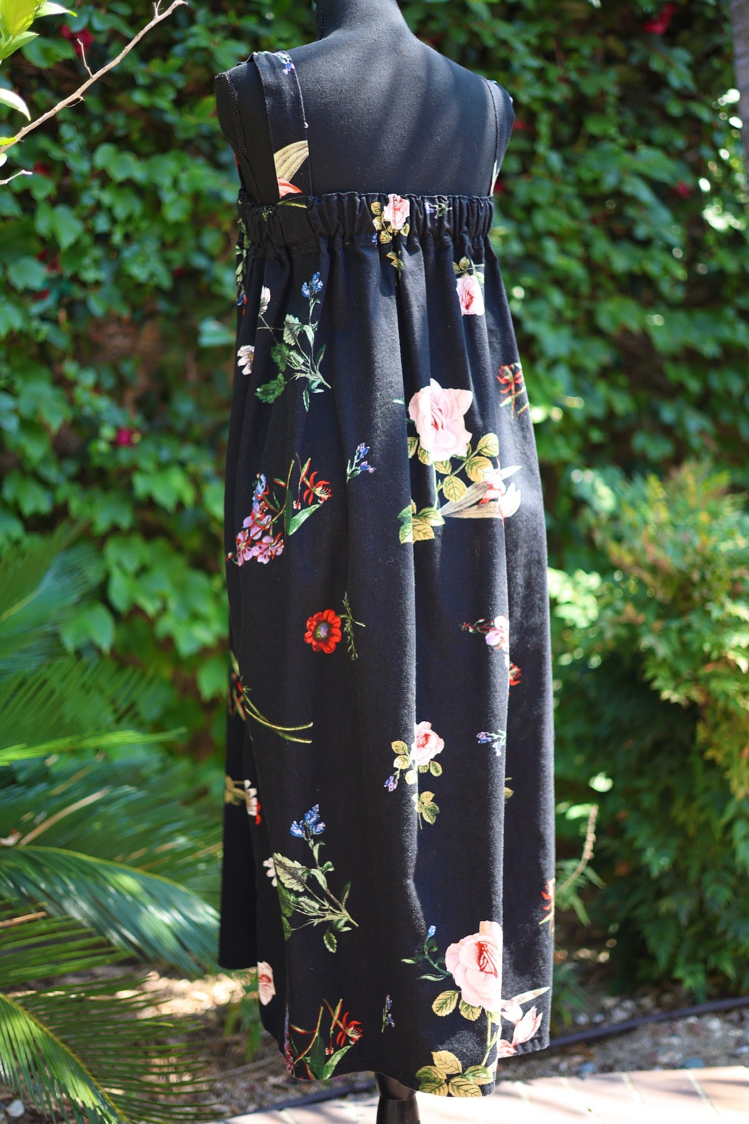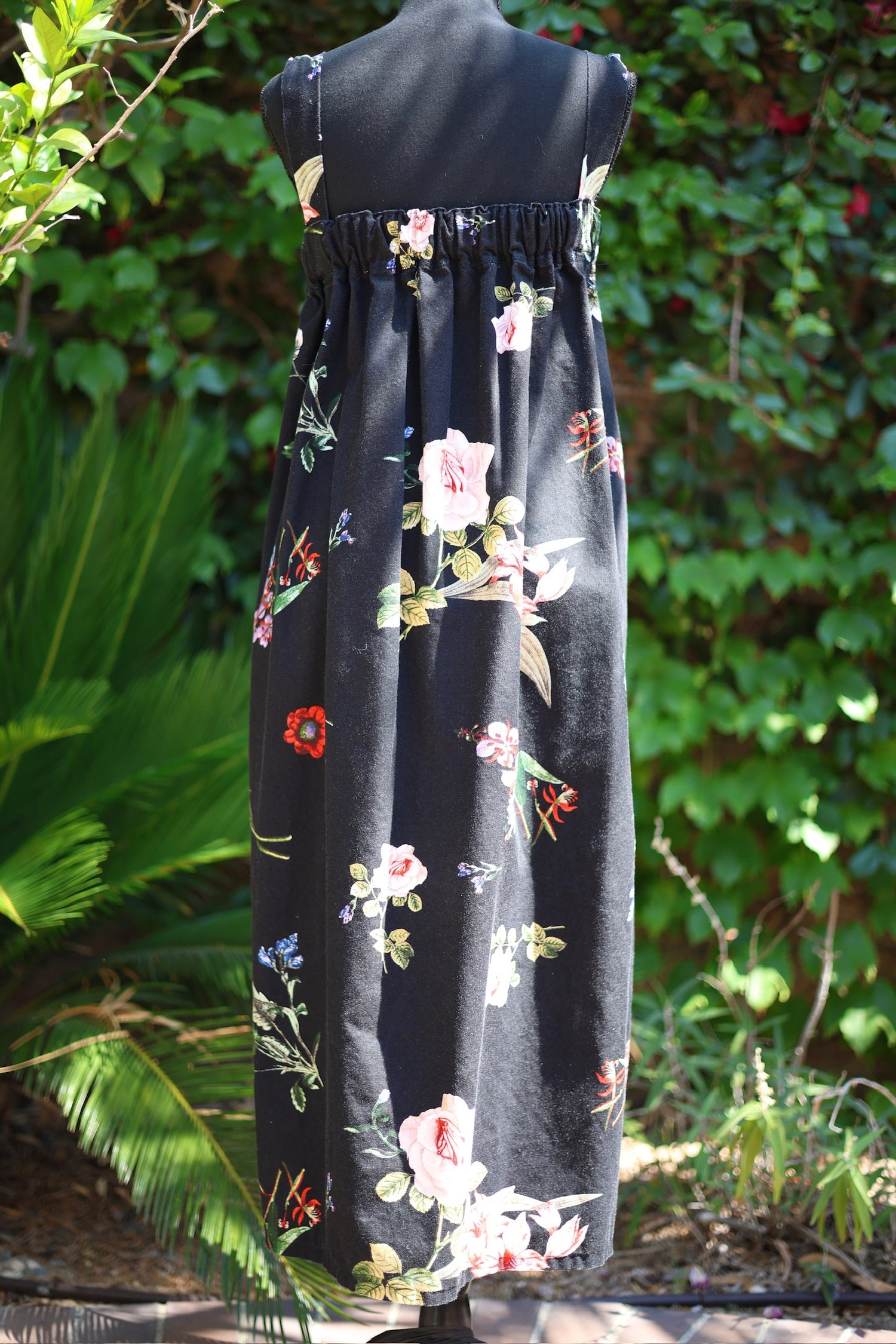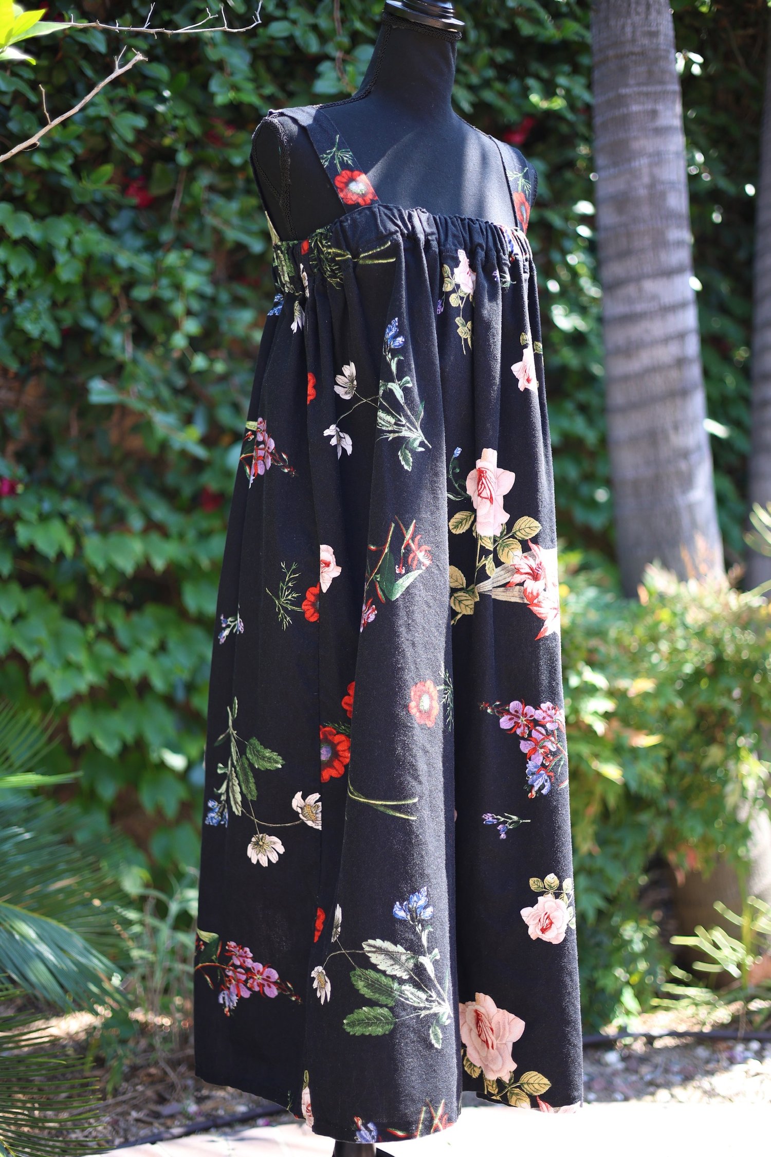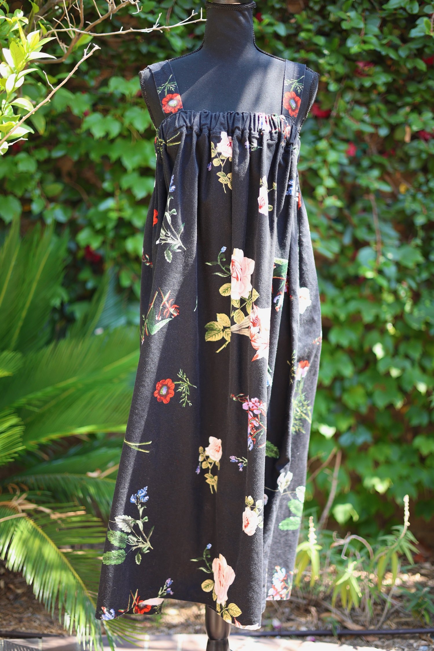 Beautiful floral goodness is the best way to describe her. Features thick straps and an elastic top to guarantee a good fit. There are no tags but she is very roomy and can accommodate various sizes. Length=45”.