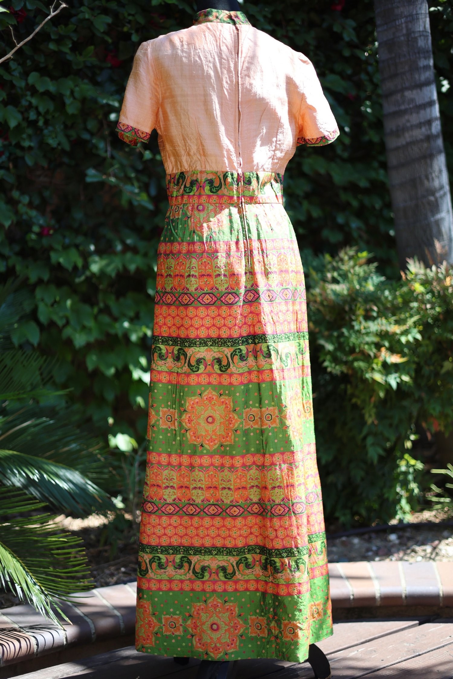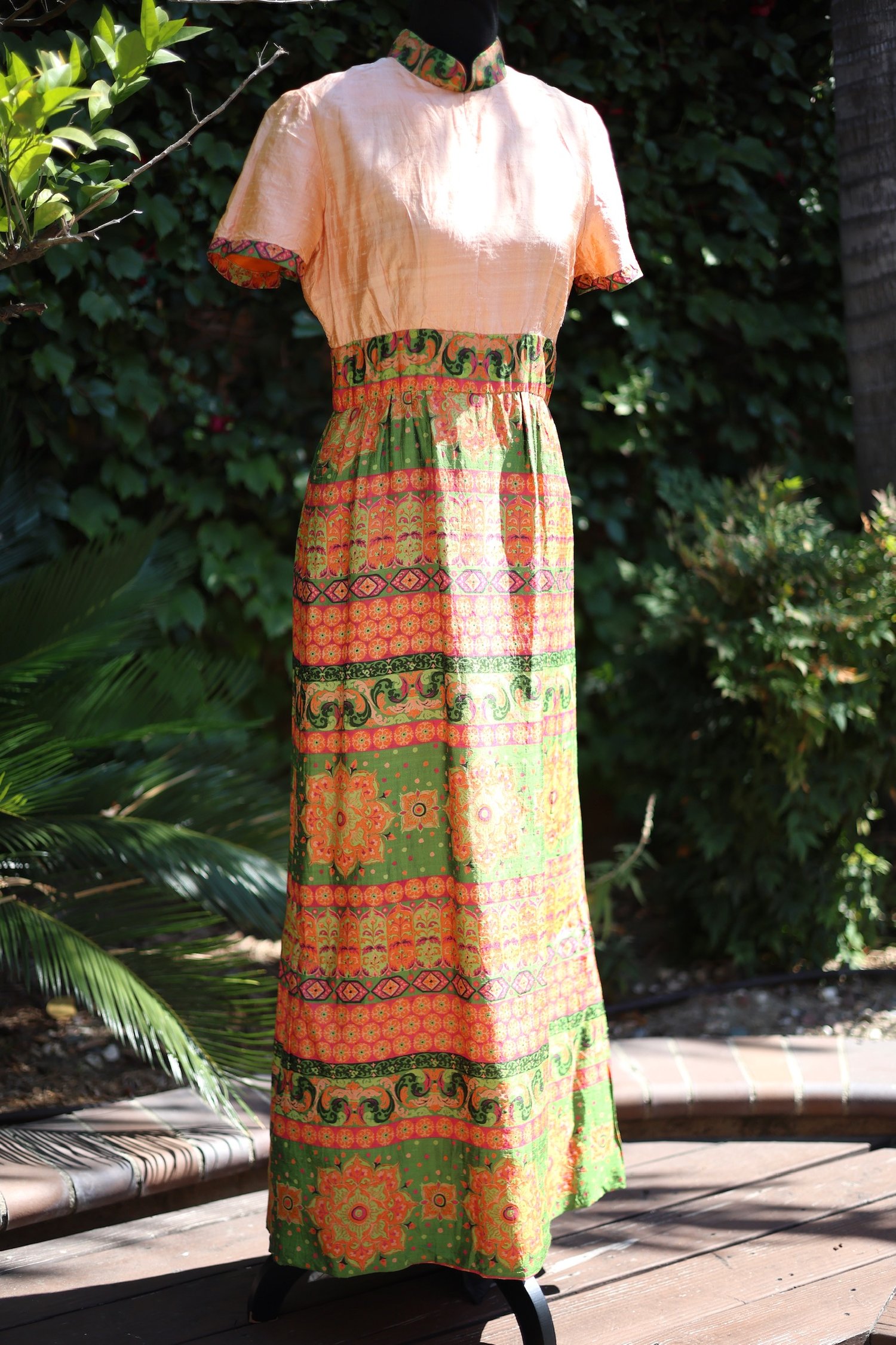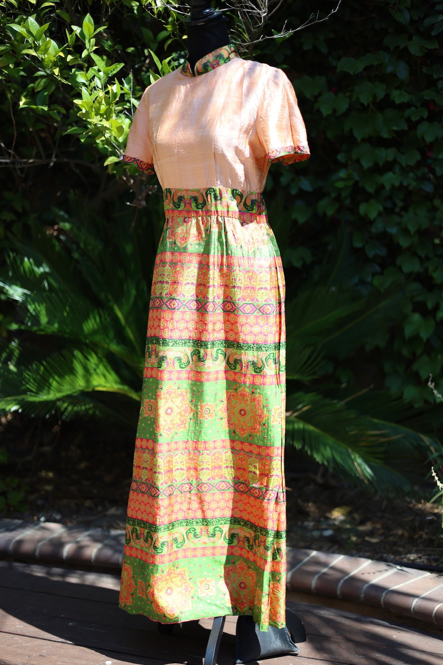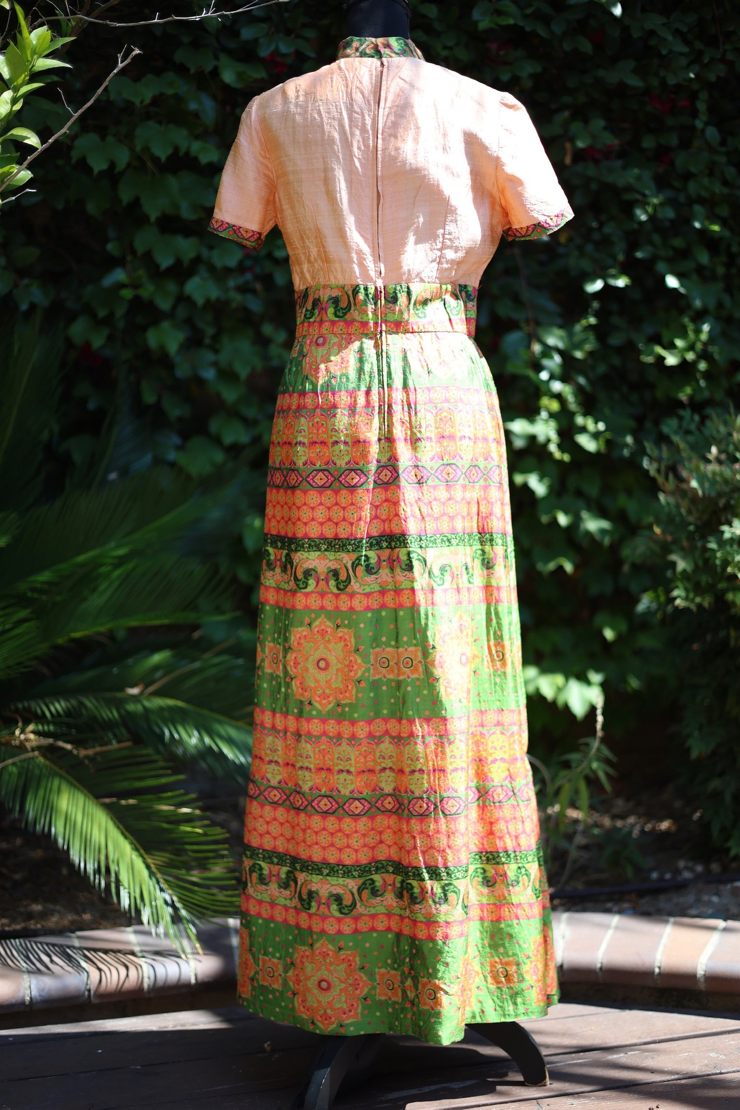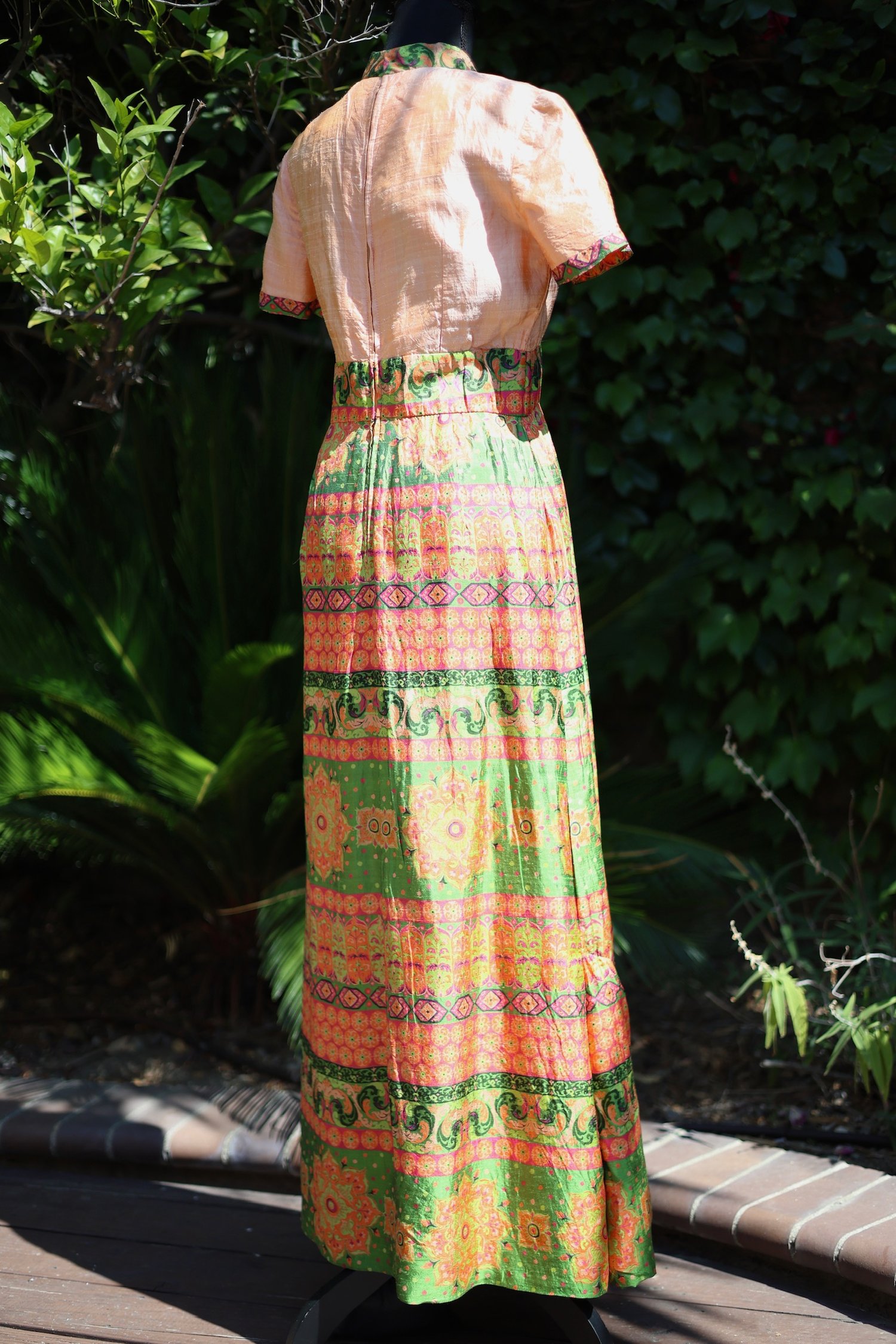Beautiful handmade piece in vibrant colors and mixed patterns. Zips up the back. No tags or labels. Waist=29” (no stretch), Length=55”. In good condition.