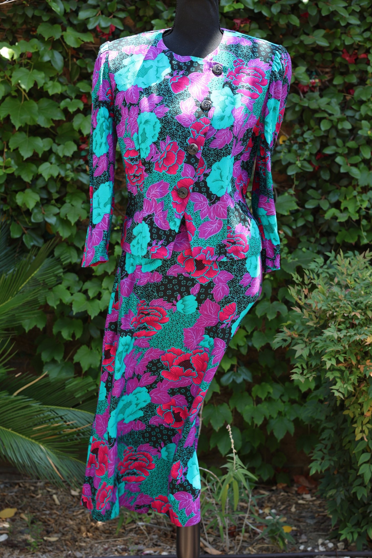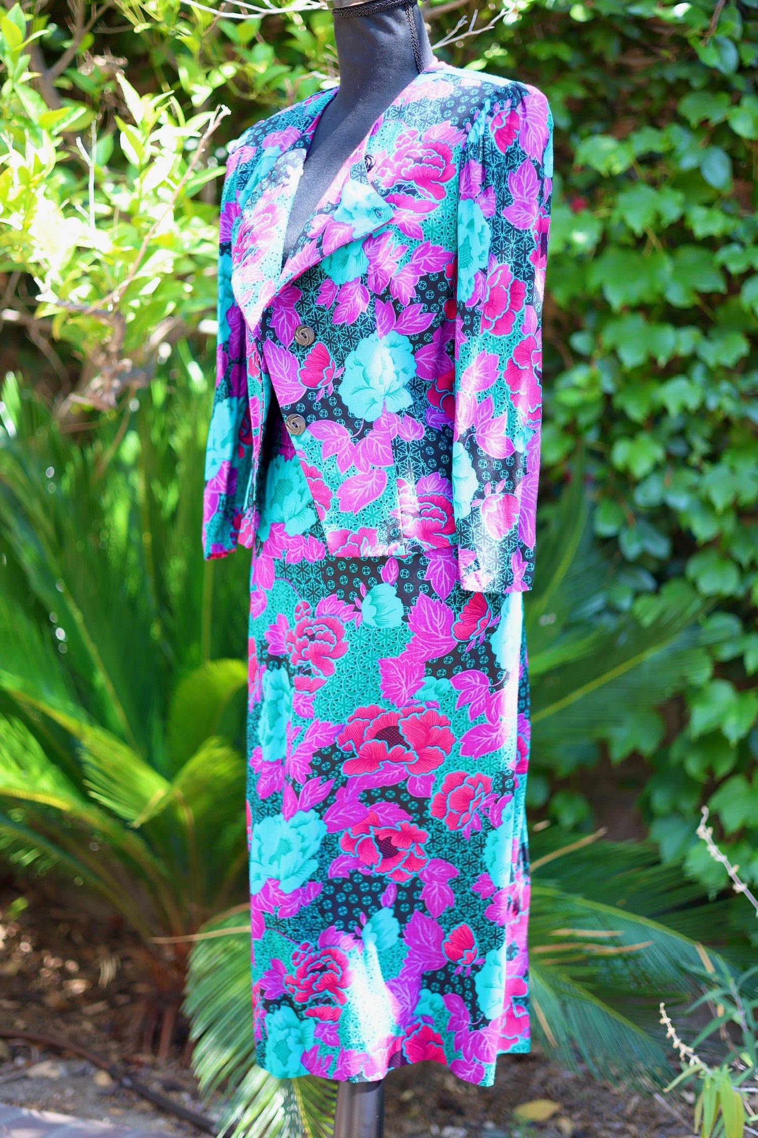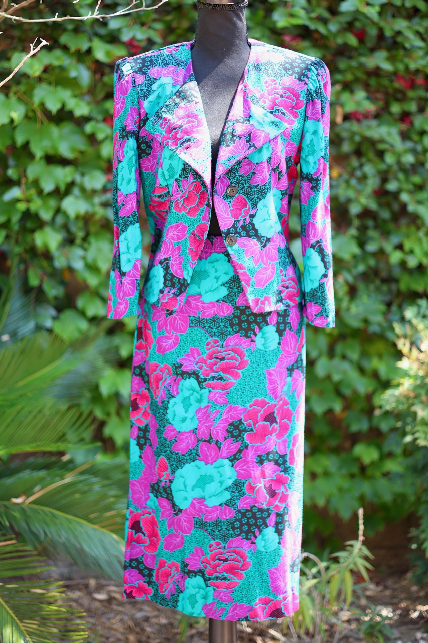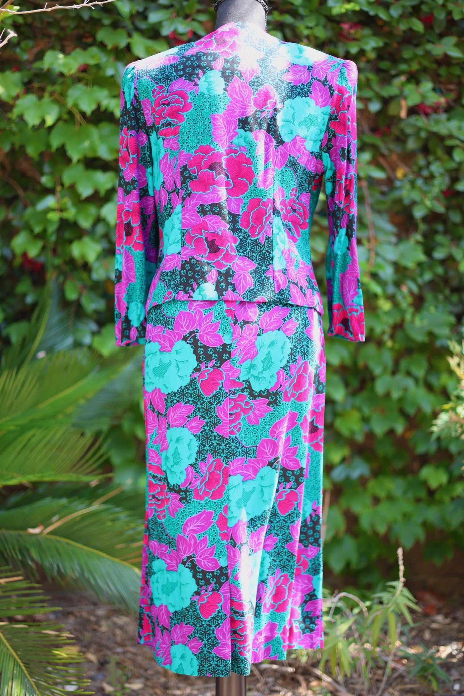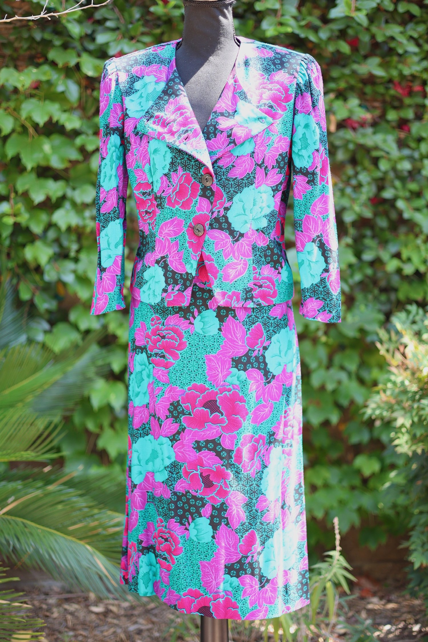 Vibrant floral print jacket and skirt set. Jacket tagged a size 10. Skirt tagged a size 18.