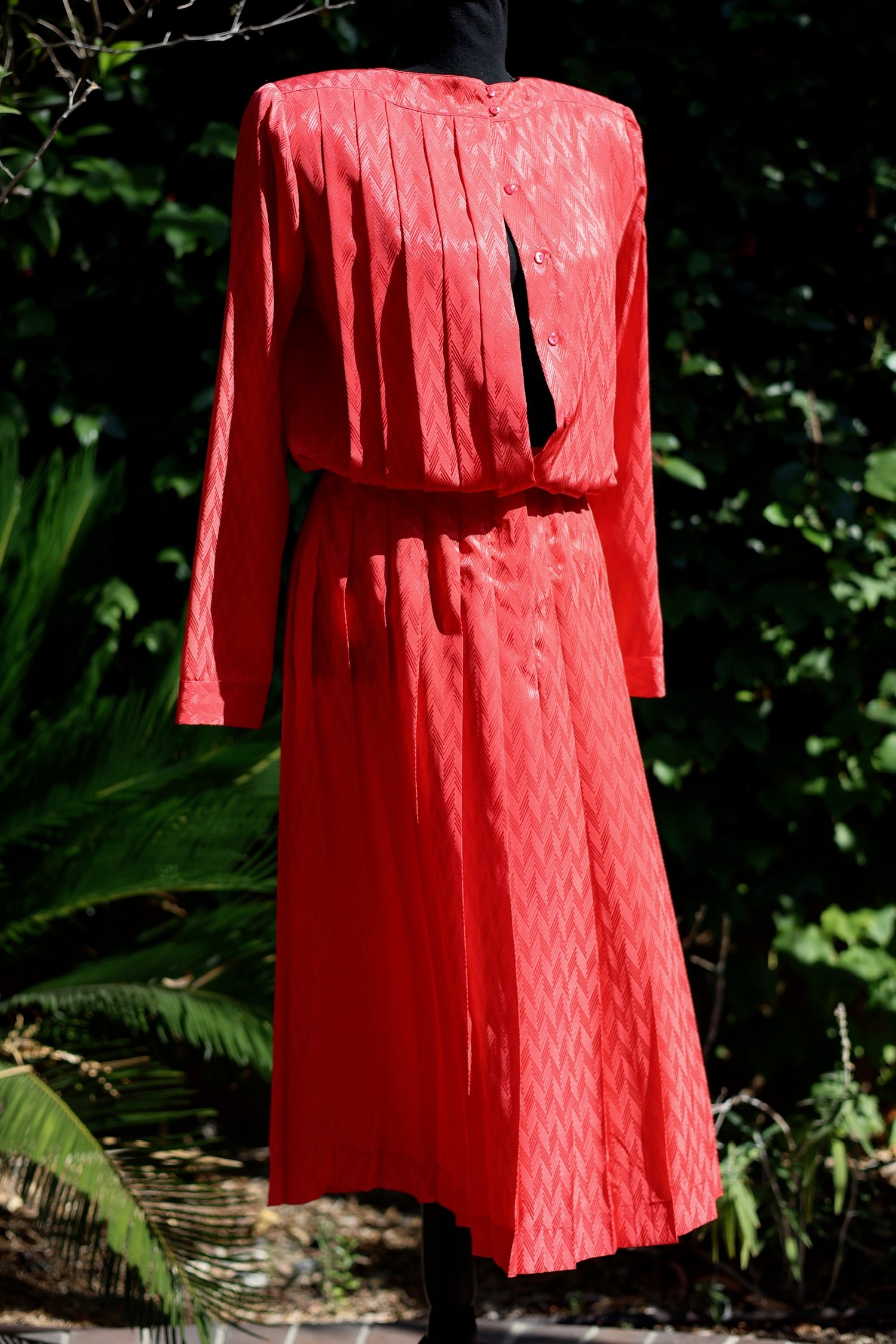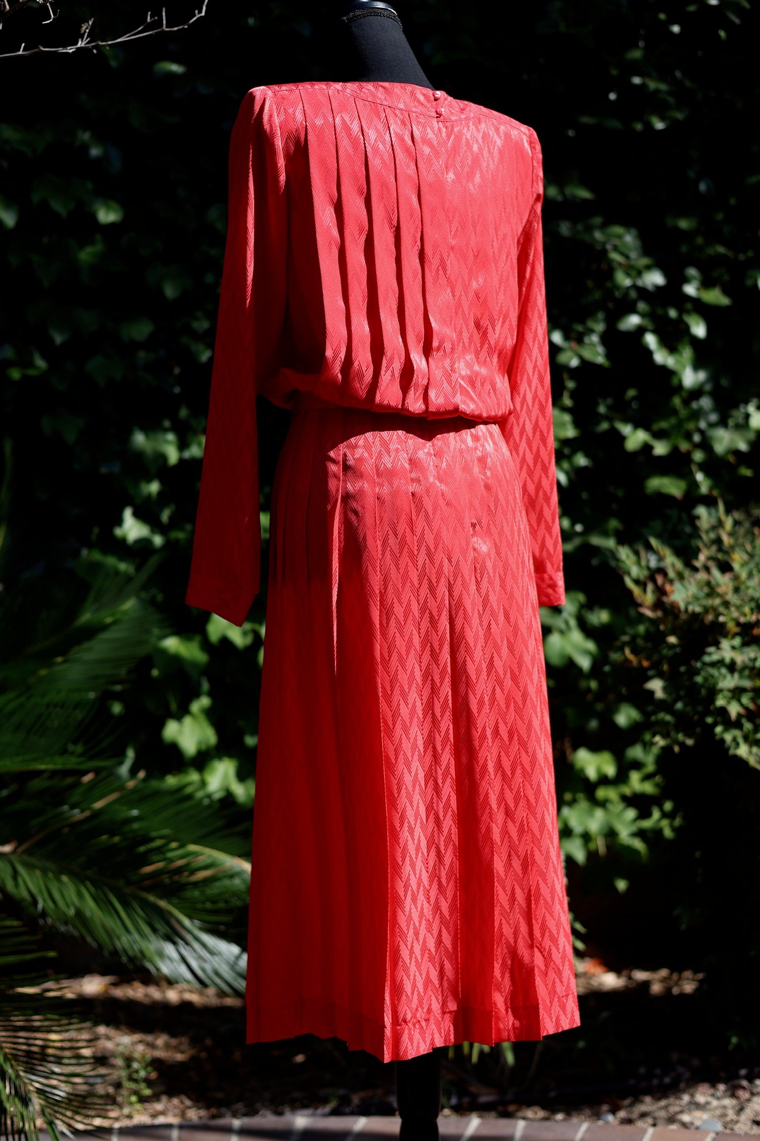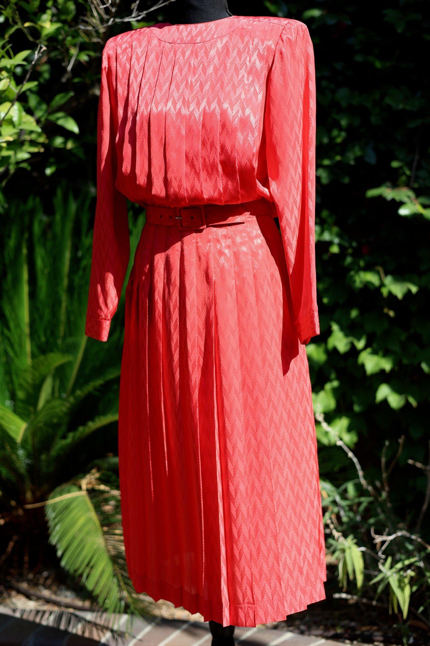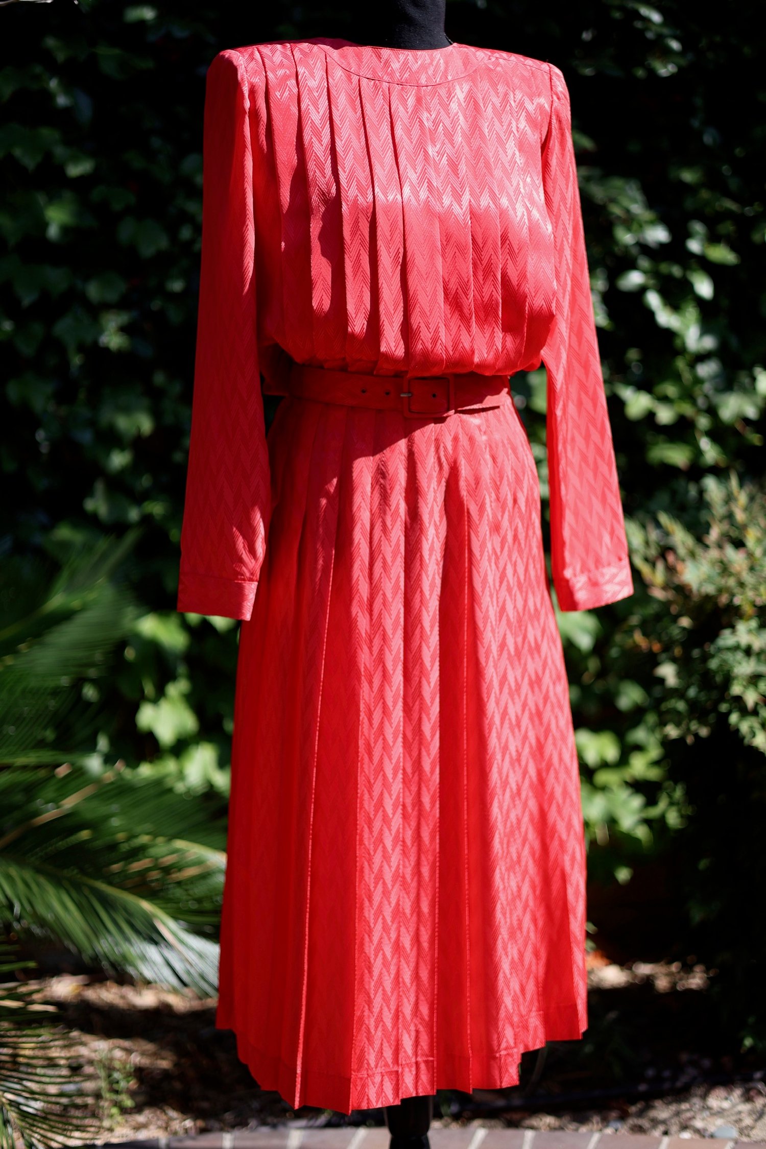 Pleated, belted dress with long sleeves and buttons down the back. Can be worn many ways.