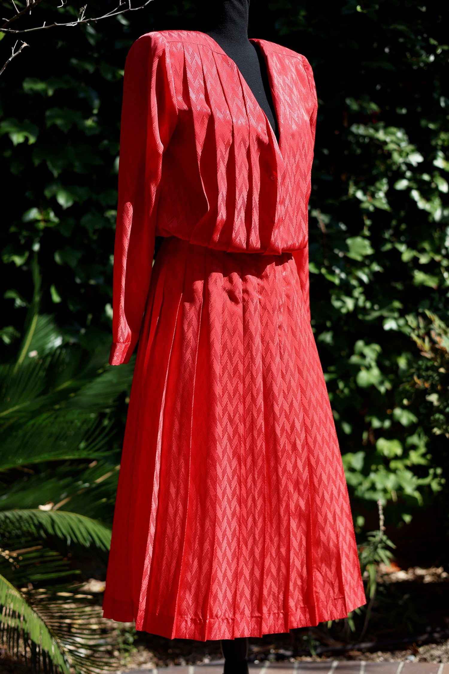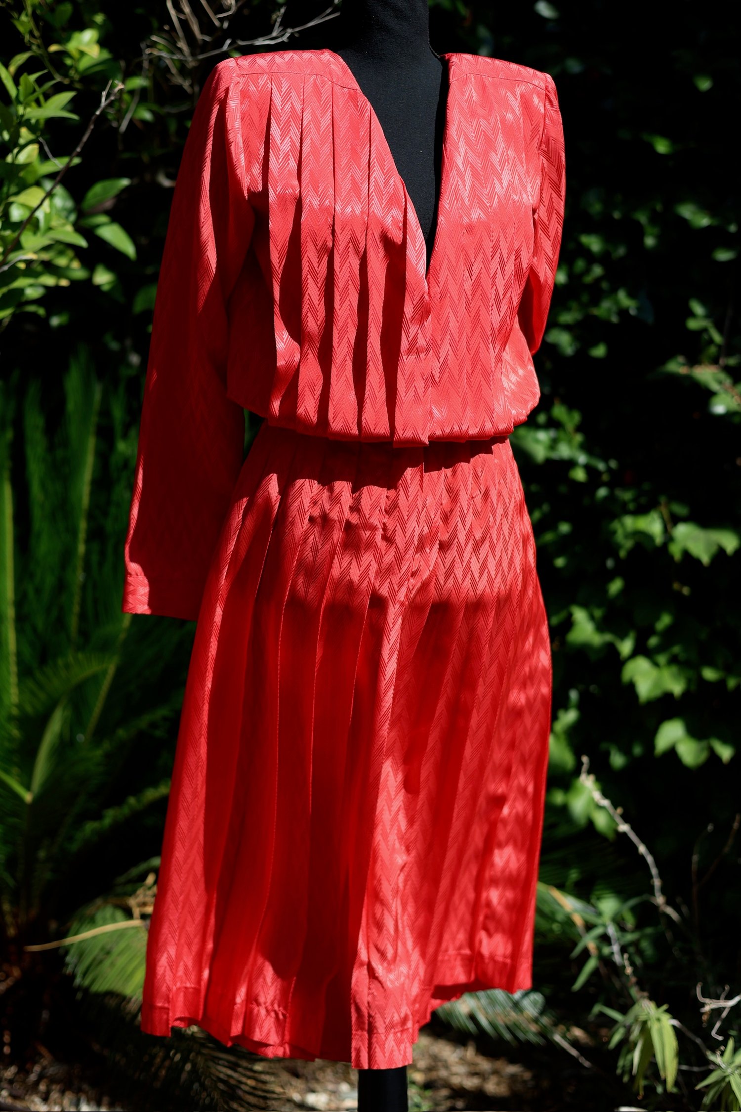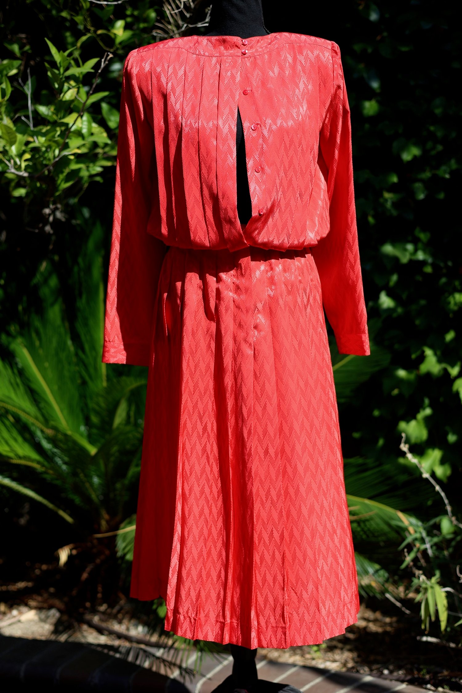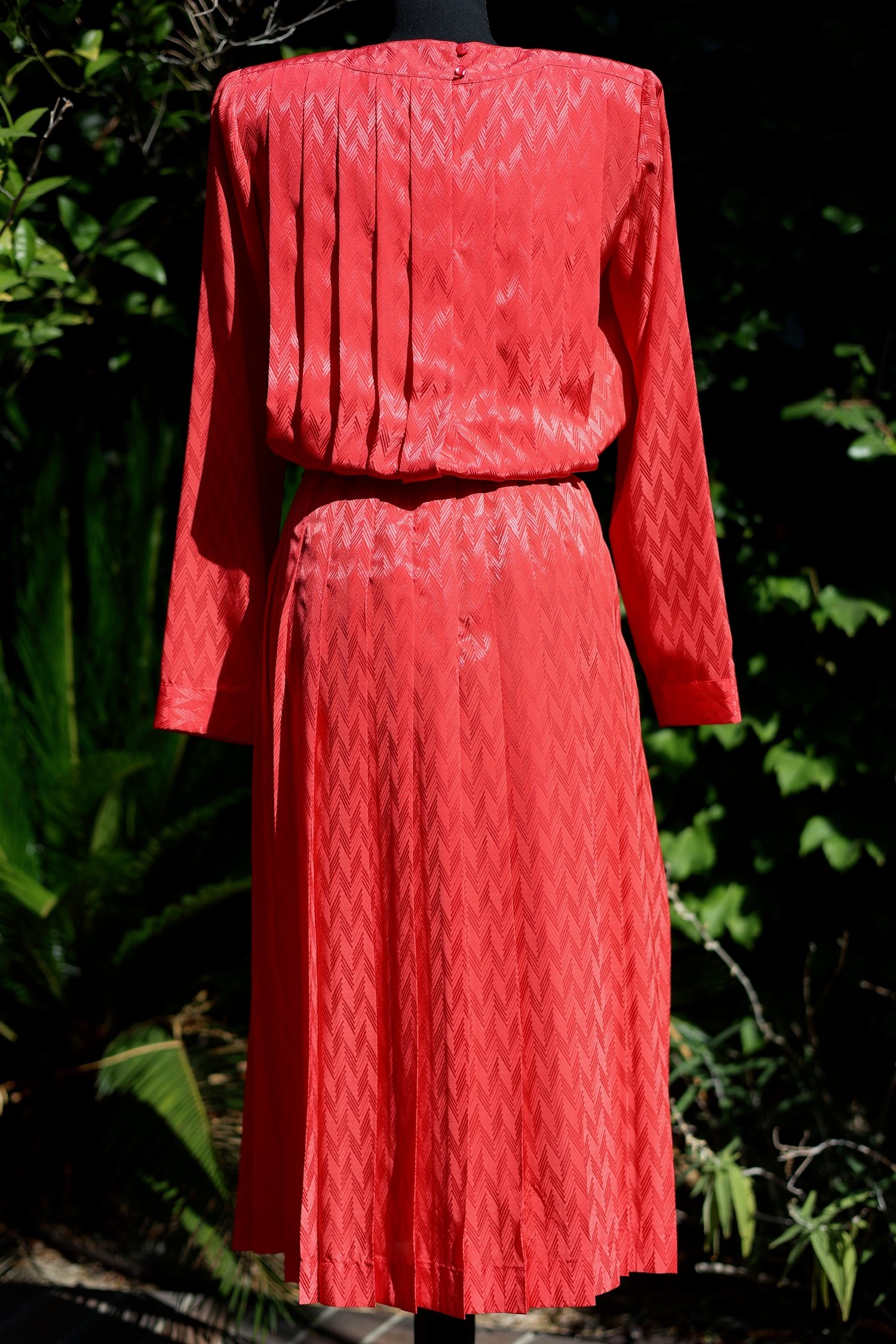 Pleated, belted dress with long sleeves and buttons down the back. Can be worn many ways.
